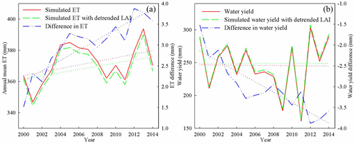 (a)和(b)分别为在真实和不考虑植被绿度变化情况下的变化趋势