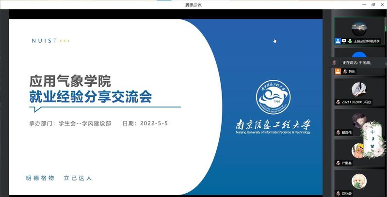 为培养本院学生良好的择业观,分析疫情下本院学生的就业形势与就业状况,进一步加强同学们对当前就业挑战与机遇的认识,明确自身优势,在时代的浪潮中激流勇进。应气院于5月5日晚19:00举办线上就业经验分享会。本次分享会邀请到了18级的任祥学长和田瑞桐学姐为大家作就业经验分享,会议由王国超同学主持。