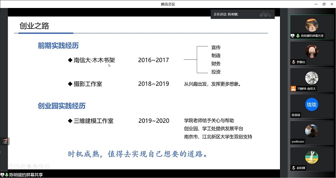 19生态学硕士陈明健以“我的创业之路—科莱气象”为题,为大家讲述了自己的创业经历以及公司产品,他给有创业梦想的同学提出了四点建议:1、拥有强烈的创业决心;2、拥有一定的技术背景;3、寻找合适的时机;4、创业道路是曲折的,要拥有一定的担当。