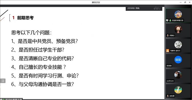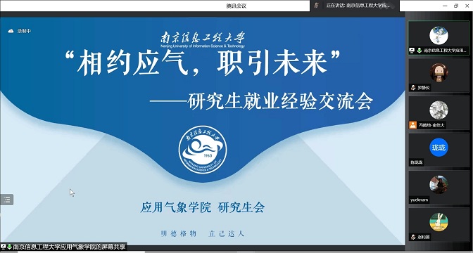 为帮助同学明确求职目标,提升求职能力,促进毕业研究生高质量就业,南京信息工程大学“研究生学术文化节——‘相约应气,职引未来’研究生就业经验交流会”于5月19日晚19:00以线上会议的形式顺利举行。会议邀请了六位研究生分享就业求职心得和考博深造经验。