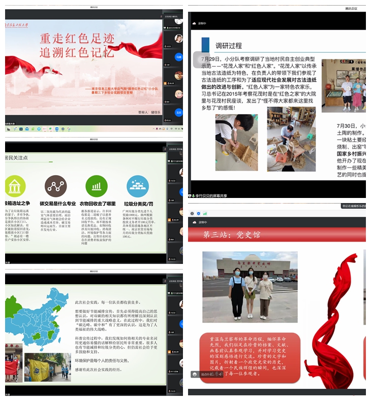 为展现2022年“三下乡”暑期社会实践活动的风采,进一步推广活动中的先进经验和教育成效,表彰先进团队,促进各团队间交流,9月14日下午,应用气象学院青年志愿者协会在腾讯会议召开了暑期社会实践答辩会。学生会、青协主席团代表金靖昊、朱道明、吴诗杰、刘洋以及曾获特等奖的何龙鑫同学,担任此次答辩的评审嘉宾,院青协的马婧同学主持此次会议。本次答辩共有11支团队参加。