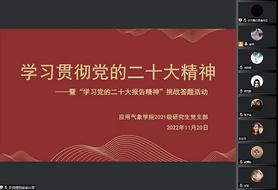 为深入学习贯彻党的二十大精神,11月20日上午,2021级研究生党支部组织开展“学习二十大奋进新征程”主题活动,活动由线上集中学习和挑战答题活动两部分组成,全体党员积极参与,自觉把思想和行动统一到学习党的二十大精神上来。