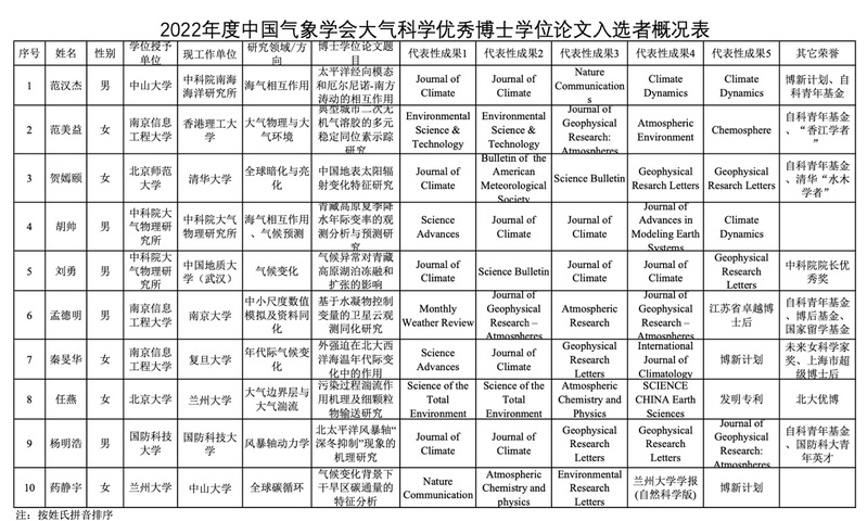 本届气象学会优博评选,由申请人申请及单位推荐,从全国气象类高校中筛选出24篇博士论文,通过口头汇报、专家质询、专家组投票环节,从通过资格审查的论文中评选出了10篇优秀论文。