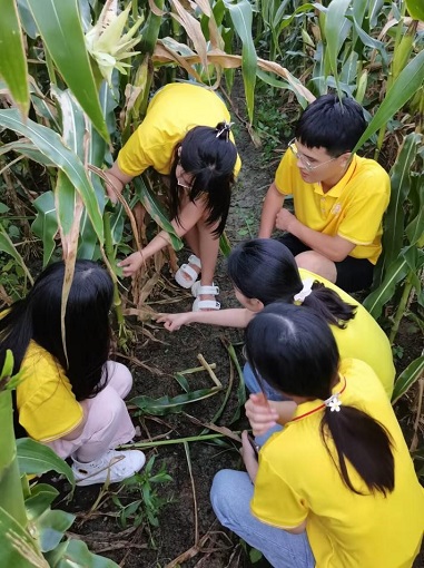 8月16日,团队成员来到永丰陈庄农田进行实地考察。成员们通过调查农田的施肥、灌溉情况,观察玉米、水稻等农作物的生长状况,询问农民田间管理措施,结合课本知识为基础,深入感受了农业生产过程中在作物栽培、灌溉、施肥等生产环节,如何运用绿色低碳的生产方式,实现农业绿色发展。