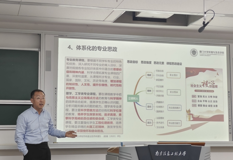 会议特邀厦门大学环境与生态学院副院长黄凌风教授作课程思政专题报告。黄凌风从教师塑造灵魂、塑造生命的职业使命出发,指出新时代高校教师应以“学为人师,行为世范”为根本追求,兼具“敬业、教学、学术、道德、家国”五重情怀,努力实现育人育才的有机统一。黄凌风引导教师思考如何将专业教学与思政教育自然融合,分享了生态学专业课程思政体系构建路径和“厦大经验”,为在场教师提供了可借鉴的顶层设计思路与实践模式。他提出,课程思政应做到“信手拈来”,将生态文明理念有机融入教学全过程,实现知识传授与价值引领的统一。最后,黄凌风以“心中有爱,眼里有光——做一名有情怀的大学老师”寄语在座教师,在育人道路上持续精进、步履不停。本次讲座为学院深化师德师风建设和课程思政建设、提升教师育人能力提供了有益启示。